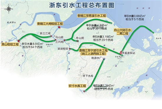 浙東引水工程以杭州蕭山樞紐為起點,引富春江水,分南北兩路并行,北線經(jīng)曹娥江到慈溪,南線則經(jīng)曹娥江到寧波以及舟山,真正實現(xiàn)了“一江春水向東流”,惠及杭州、寧波、紹興、舟山4個市、18個縣(市、區(qū))、1750多萬人口。